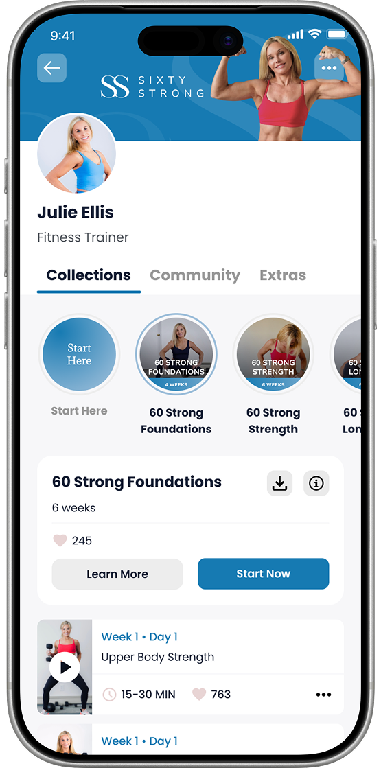 The 60 Strong app gives you step‑by‑step workouts, clear video demonstrations, and expert coaching — all designed specifically for people 60 and beyond. You’ll know exactly what to do each day, how to do it safely, and how to progress at your own pace so your joints feel supported, not stressed.